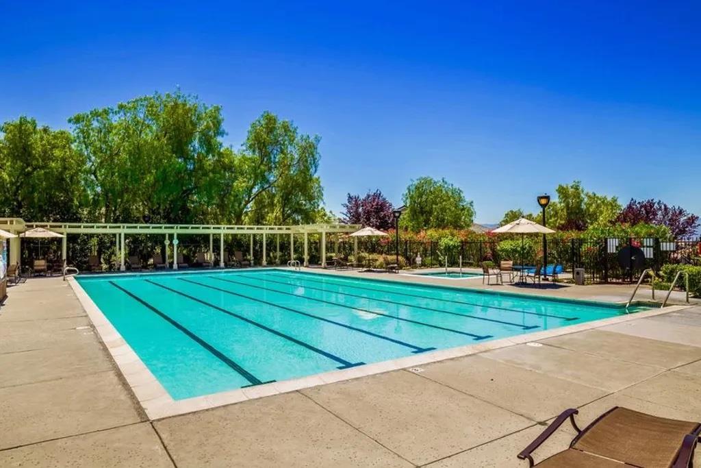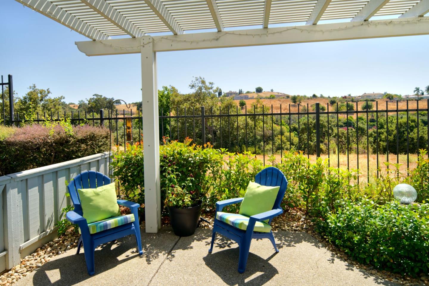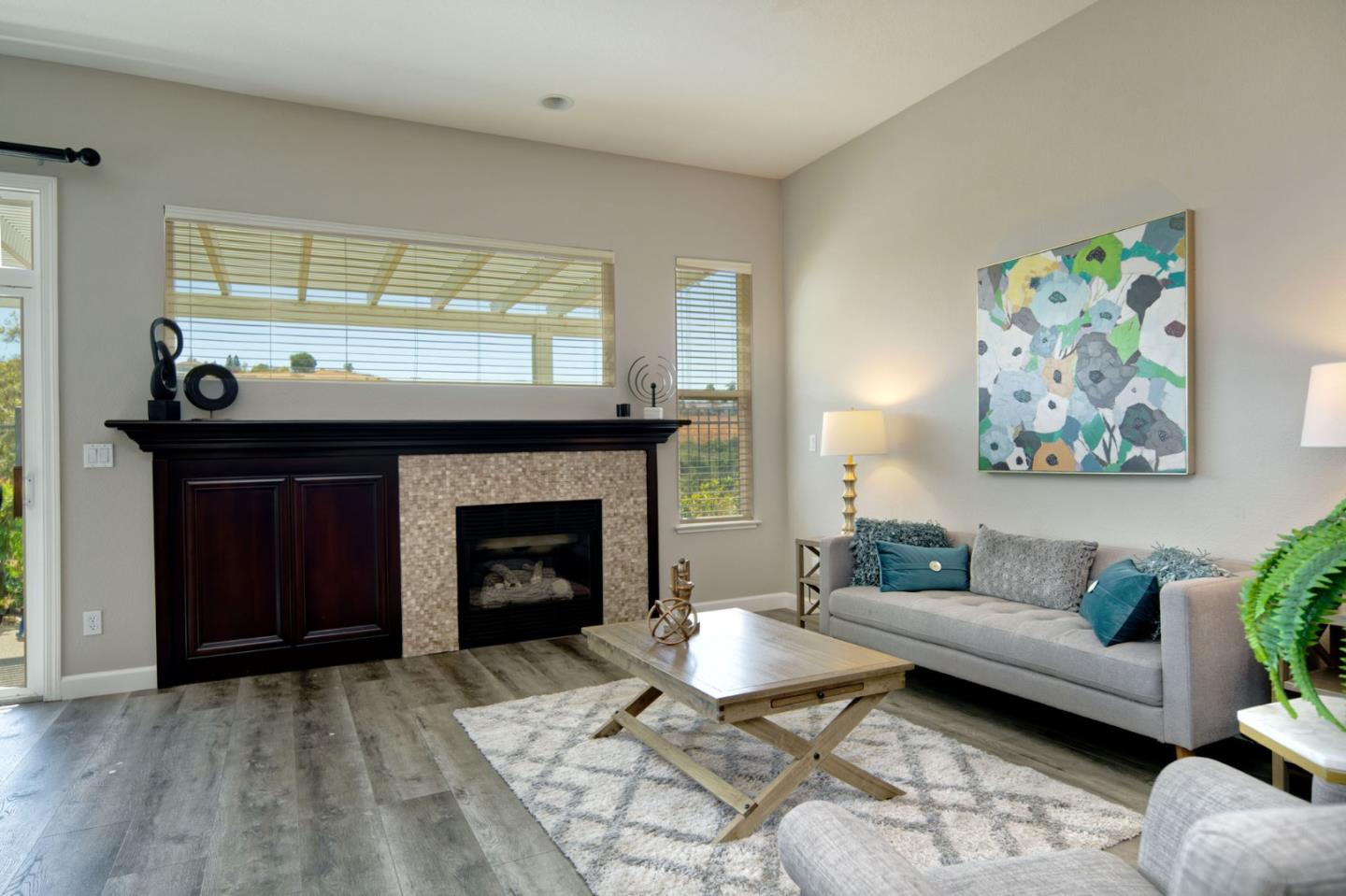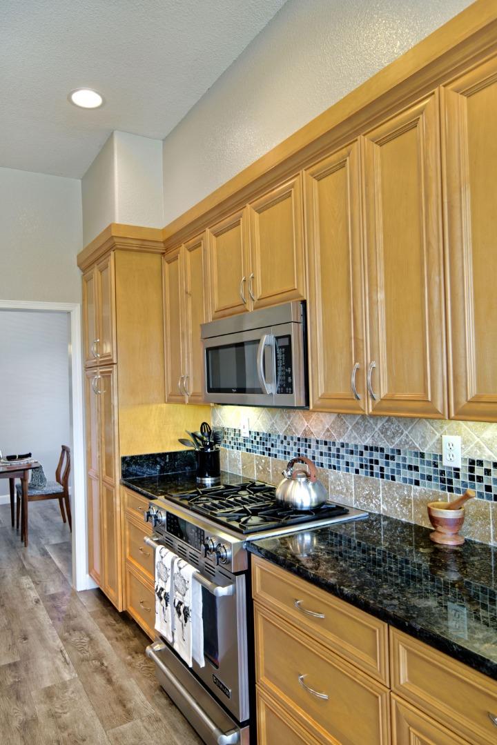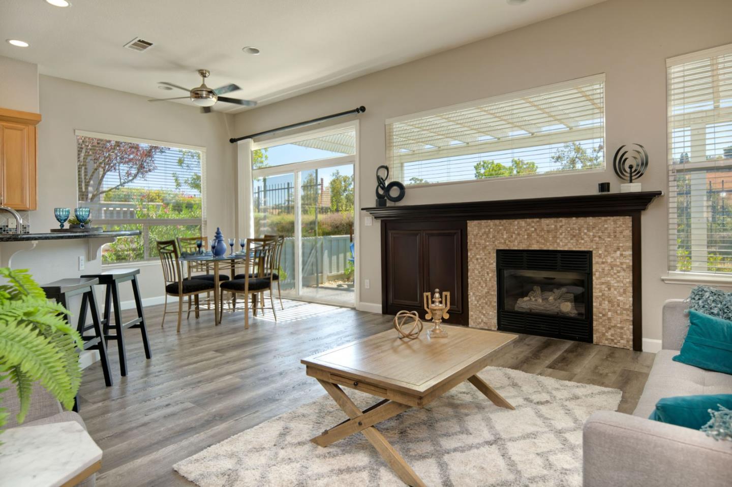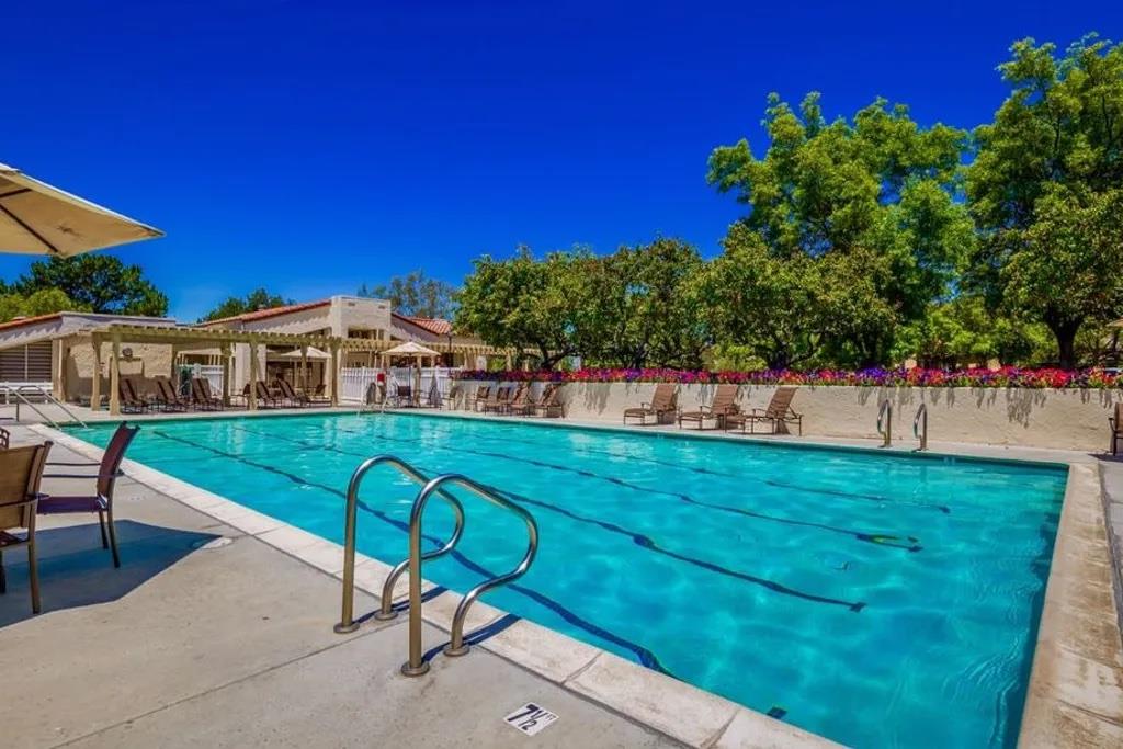 Discover this beautifully remodeled single-level end unit in a vibrant, gated 55+ senior community. This 2-bedroom + den, 2-bath home features a tile entryway, high ceilings, and a custom gas fireplace. The chef's kitchen boasts wood cabinets, granite countertops, stainless steel appliances, and a custom-tiled backsplash. Updated bathrooms include a master bath with a walk-in shower and linen closet. Enjoy a cozy den, inside laundry, and a 2-car attached garage. The private patio offers uniquely stunning and tranquil views of the picturesque hills. Community amenities include a golf course, swimming pools, security gates, tennis and hiking trails, a fitness center, and more. This bright and airy home is a must-see!