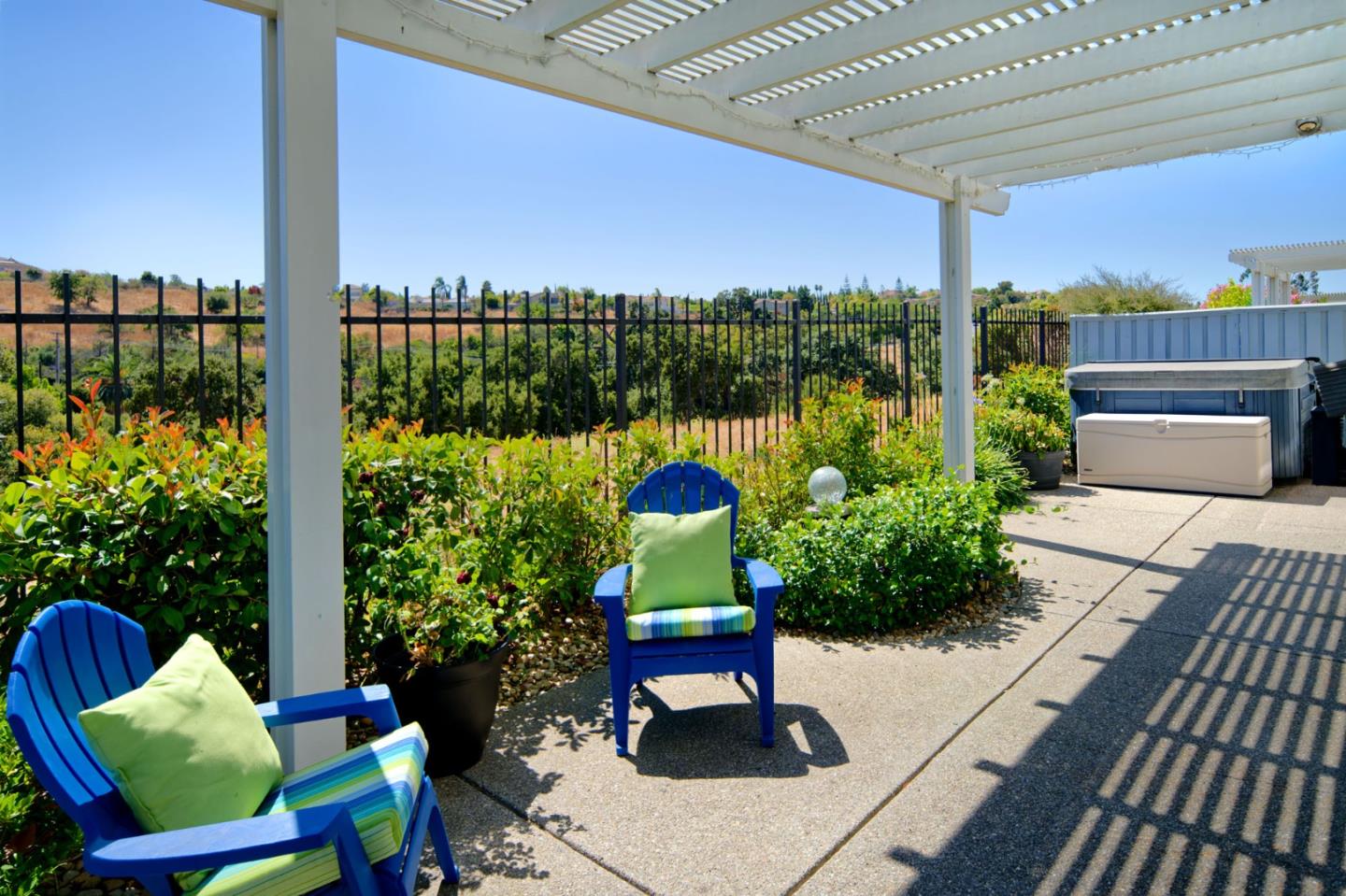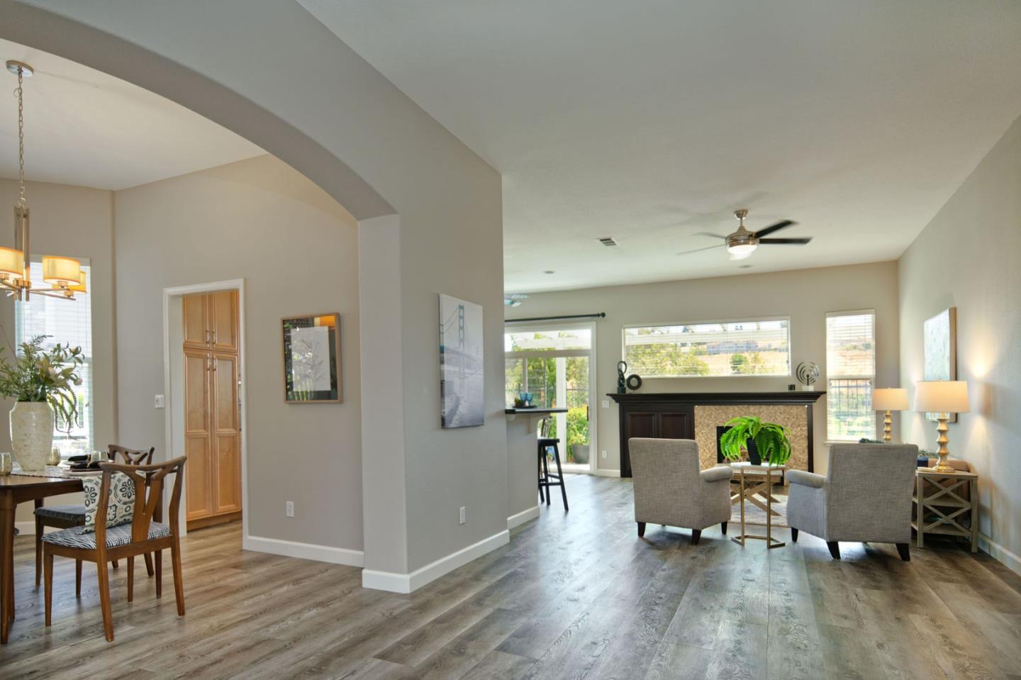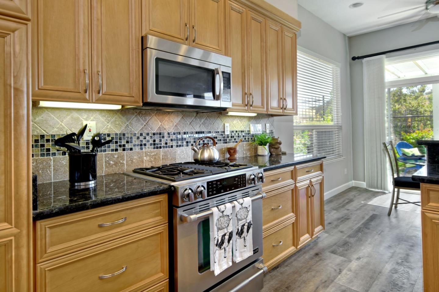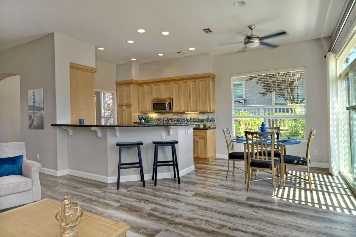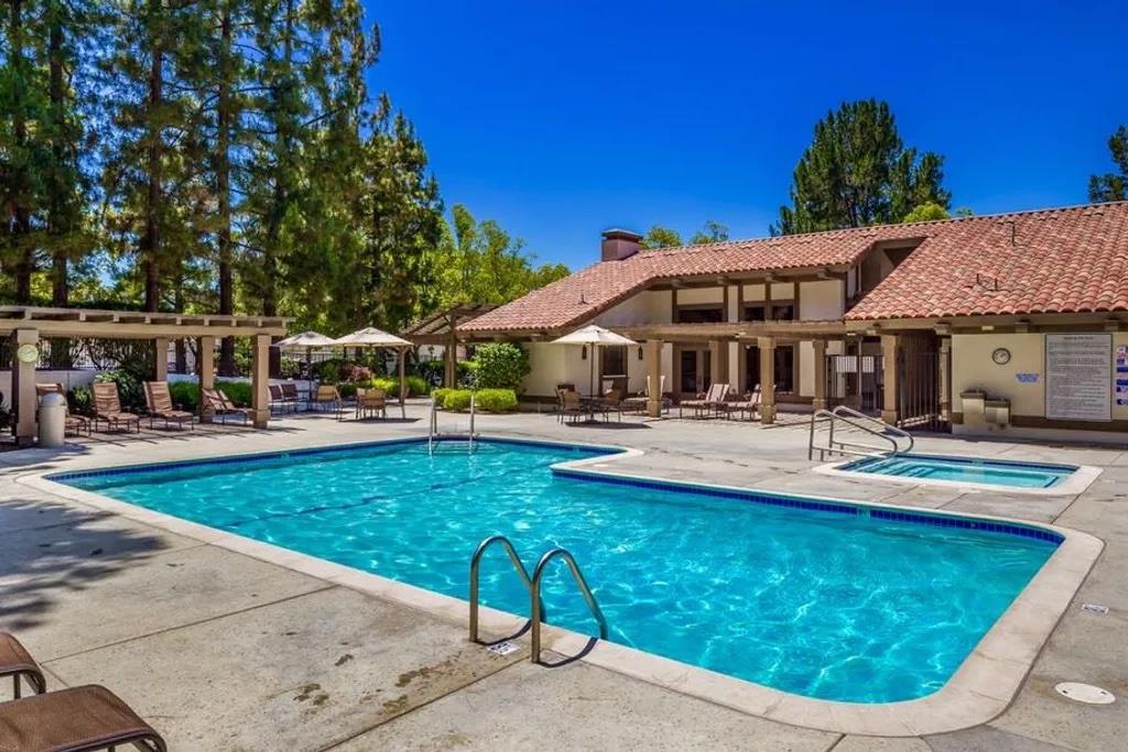 Discover this beautifully remodeled single-level end unit in a vibrant, gated 55+ senior community. This 2-bedroom + den, 2-bath home features a tile entryway, high ceilings, and a custom gas fireplace. The chef's kitchen boasts wood cabinets, granite countertops, stainless steel appliances, and a custom-tiled backsplash. Updated bathrooms include a master bath with a walk-in shower and linen closet. Enjoy a cozy den, inside laundry, and a 2-car attached garage. The private patio offers uniquely stunning and tranquil views of the picturesque hills. Community amenities include a golf course, swimming pools, security gates, tennis and hiking trails, a fitness center, and more. This bright and airy home is a must-see!